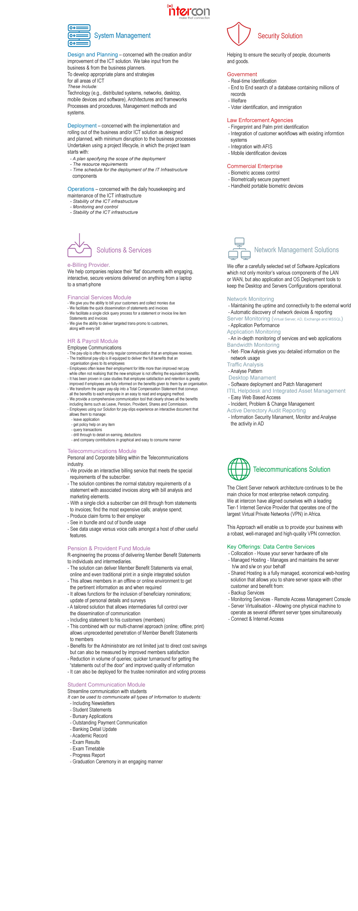 Intercon Technologies is a South African Based, and 100% black owned company focusing on providing ICT related services to clients, with the main office based in Johannesburg. Intercon Technologies shareholding and management control and structure represent an integrated national BBBEE strategy. Success in today’s business environment requires that a company’s leaders have the ability to create a vision of the organisation’s future direction as well as the course it needs to get there. We at Intercon Technologies believe that this can only be attained if we remain focused. This focus allows us to understand intimately the special needs, resources and capabilities of this type of business. We have positioned our organisation to best understand the unique challenges typically faced by our clients in installing systems and practices necessary to support growth, while maintaining the entrepreneurial spirit, which is typically the foundation of our success.